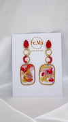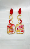 Orecchini rettangolari con pendente marmorizzato in rosso, bianco e oro. Il design vivace e le forme ricordano la spensieratezza di una festa d'estate, con il sole che accarezza la pelle e la musica che fa vibrare l'aria.