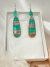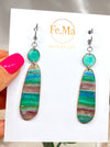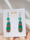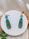 Orecchini pendenti con doppio elemento verde e goccia allungata. Essenziali ma di grande impatto, ricordano il movimento fluido delle onde sospese a mezz'aria. Per chi non ha paura di esprimere la propria forza con eleganza.
